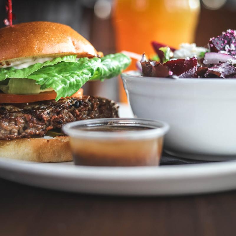 Served with your choice of Soup, Salad, Fries, Onion Rings, Tater Tots, Sweet Potato Fries, or Caesar Salad $3.50 | Greek Salad or Poutine $5.50 | Gluten Free Bun $2.50 | Beyond Meat Patty $3.50 | Bacon $3.50 | Cheese $3.50 | Sauteed mushrooms $3.50